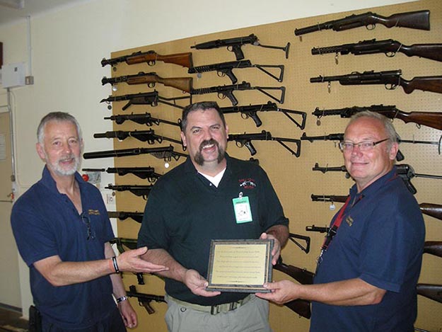 July 2013- Master Gunsmith Matt Babb was on TDY in the UK, and the Staff at the Shrivenham Small Arms Collection decided to participate in a special recognition ceremony for an award of the prestigious Purple Target. Master Gunsmith Phil Harding (Left) and Lt Col (Retd) John Starling (Right) participated in presenting the brass plaque to commemorate the occasion that inspired the award- rumoured to involve a Hi Standard Military H-D Suppressed and “that damnable spring” and a finger.