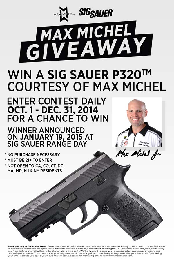 Meruax, La. (October 2014) – Max Michel, Jr., champion competitive shooter, firearms instructor and television personality, is pleased to announce today the official launch of a new contest aimed to thank his fans for their continuous support. The contest, run through Michel’s official Facebook Fan Page, will award one lucky winner a new, in-the-box SIG SAUER® 9mm P320™ Carry with a Nitron slide finish and SIGLITE® Night Sights (approximate MSRP value of $713.00). The contest will run from October 1st through December 31st, 2014. The winner will be randomly selected and announced at the SIG SAUER® Range Day on January 19th, 2015 prior to the 2015 SHOT Show held in Las Vegas, NV January 20th – 23rd, 2015. To enter the contest, please visit here: http://woobox.com/fqwnmu